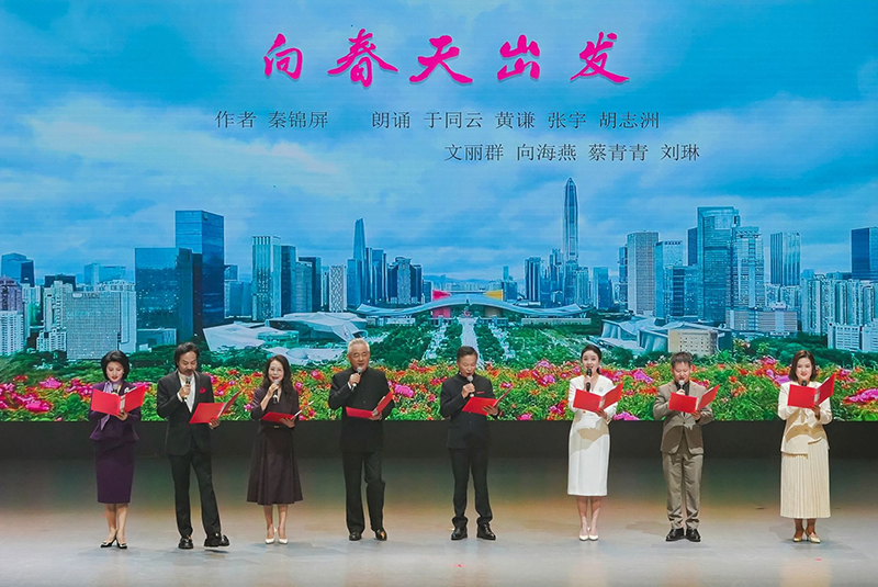 值得一提的是,朗诵会上还选用了深圳作家秦锦屏的原创力作《向春天出发》作为朗诵会的主题诗,为这场文学盛宴注入了鲜明的本土元素。从古代文学到现代诗歌,从经典散文到当代创作,丰富的作品内容和深刻的内涵,使得整场演出既是一次文学的洗礼,也是一场语言艺术的精彩呈现。