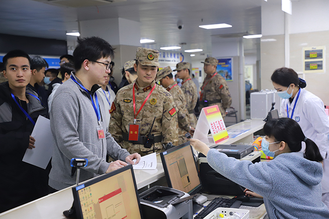 当天,参检应征青年整齐集结,精神抖擞,在工作人员的引导下,分批有序地进行了外科、内科、超声等多个项目的检查。期间,区征兵办秘书组协同医务人员,落实“双盲”体检要求,认真查看每个环节,掌握工作进展,严格按照征兵体检流程和标准,对每一位应征青年进行逐项检查,严把兵员质量第一关,确保筛选出身体素质过硬的青年投身国防建设。整个体检过程有条不紊,严谨细致。