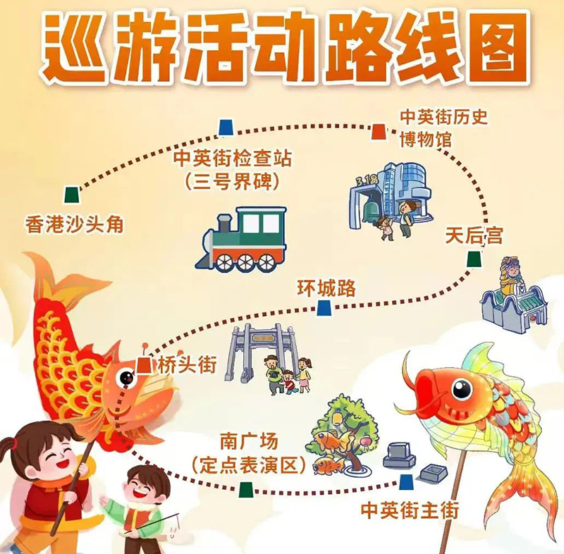 活动日程安排:本周日,公历4月20日上午9点30分沙栏吓村天后宫庆典仪式开展上午11点-12点非遗大巡游。香港沙头角舞龙队从三号界碑处进入中英街深圳一侧,鱼灯舞队迎接,绕中英街开展非遗巡游活动。