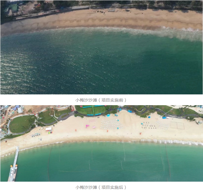 项目按照“山水林田湖草沙”一体化治理思路,对沿岸山体、小梅沙河流域和砂质岸线进行整体生态修复,引入培育深圳特色的本地物种红花油茶、佩兰等共2484株,约200平方米,提升片区生物多样性;修复河道812.66米,建设生态湿地约1.1万平方米,提升小梅沙河生态自净能力;推动3.3万平方米沙滩100%完成修复,基本完成800米砂质岸线修复。