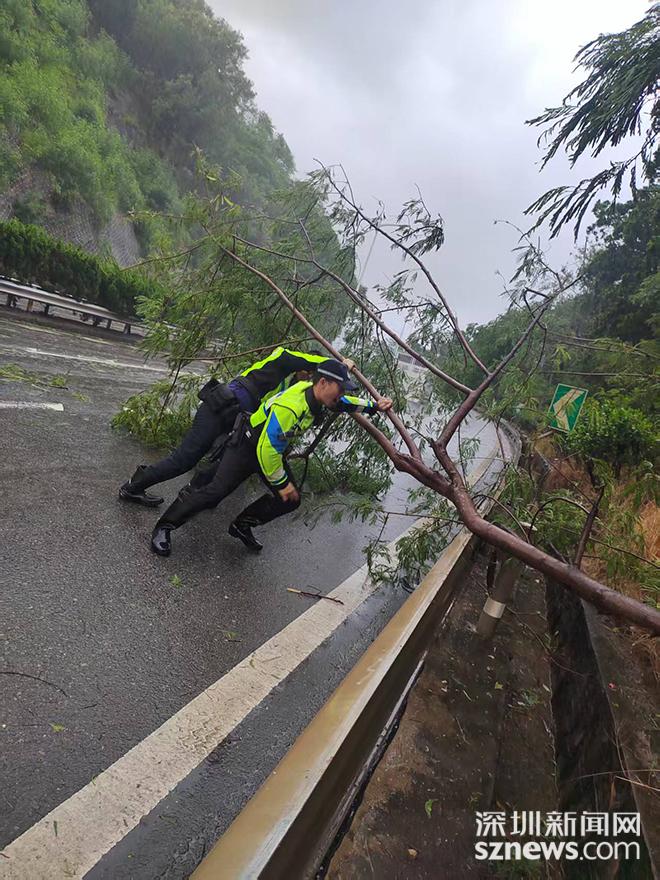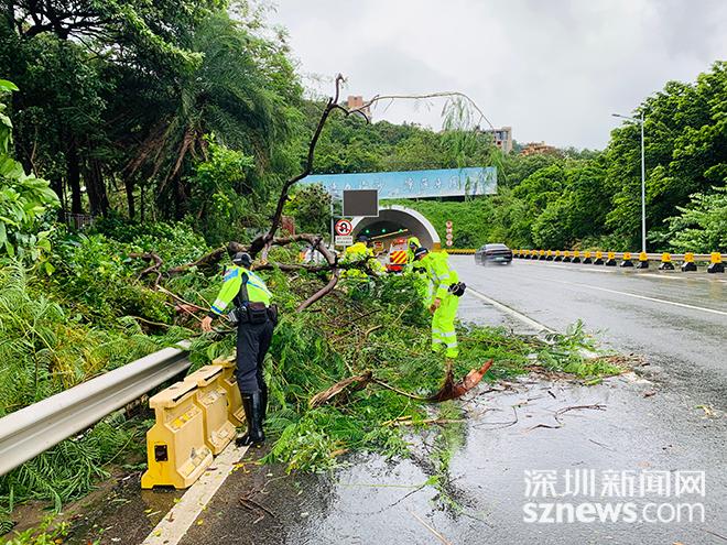 在盐梅路路段,粗壮的树枝干横跨整个车道,如同一道“路障”,将道路拦腰截断,车辆通行严重受阻。而在惠深沿海高速西往东方向、大梅沙隧道入口处,情况同样危急,多根断枝散落在车道上,时刻威胁着过往车辆的行车安全。