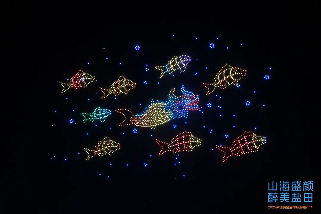 整场开幕式在无人机编队表演中达到高潮,两千架无人机在空中以夜空为幕、光点为笔,勾勒出从海岸线到深海的全域生态图景。当灯塔图书馆、云海公园、恩上湿地公园、梅沙尖等网红地标在夜空依次点亮时,市民游客兴奋地辨认着熟悉的景观,赞叹声此起彼伏。