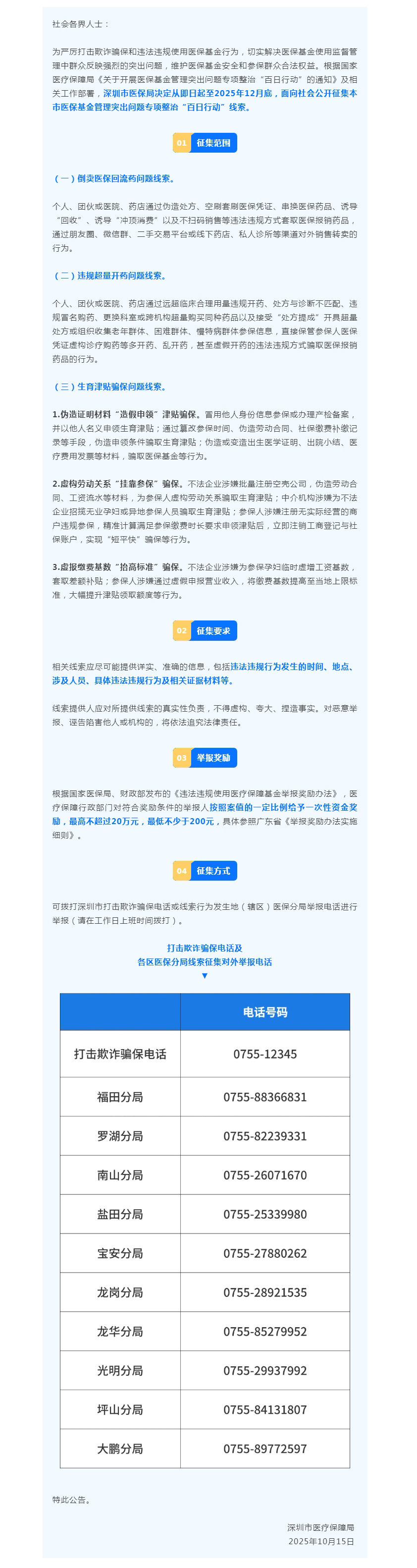 深圳市医疗保障局关于征集医保基金管理突出问题专项整治“百日行动”线索的公告
