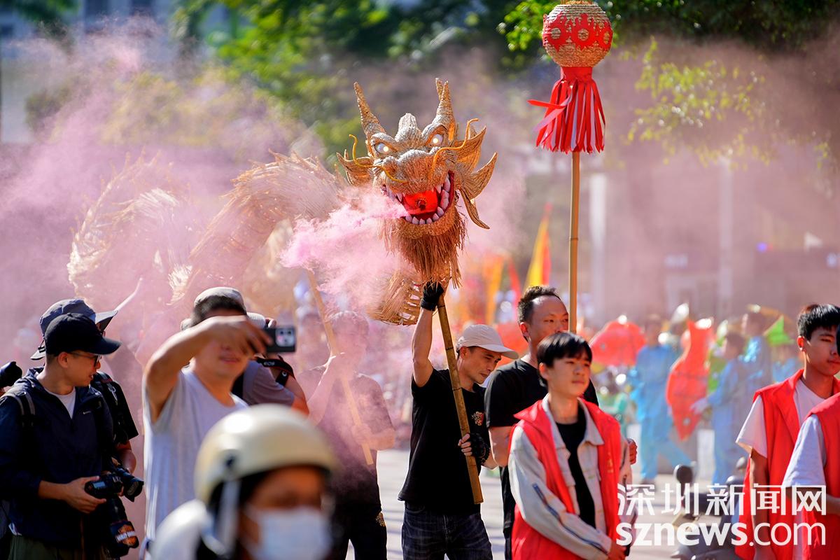 与展演同步进行的非遗大巡游,为盐田街头增添了浓厚的文化氛围。巡游队伍阵容强大,11个非遗方阵依次登场,麒麟舞、鱼灯舞、疍家人婚俗、追龙等特色项目一一亮相,形成了一道流动的城市文化风景线。巡游途中,沿街市民纷纷驻足观看、拍照留念,不少小朋友跟随着队伍奔跑互动,非遗在街头巷尾的欢声笑语中完成了一次“零距离”传播,真正走进了群众日常生活。