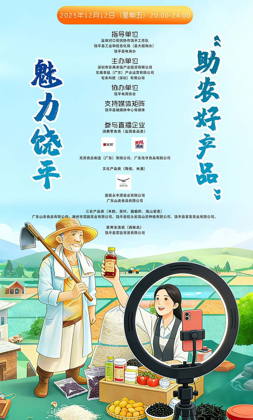为进一步推动乡村振兴,助力农产品上行,在盐田对口帮扶协作饶平工作队和饶平县工业和信息化局(县大招商办)及饶平县电商办指导下,深圳市东禹幸福产业投资有限公司携手宅未科技(深圳)有限公司,联合饶平电商协会,将于12月12日举办“‘魅力饶平·助农好产品’电商直播饶平专场暨线上选品对接会”活动。