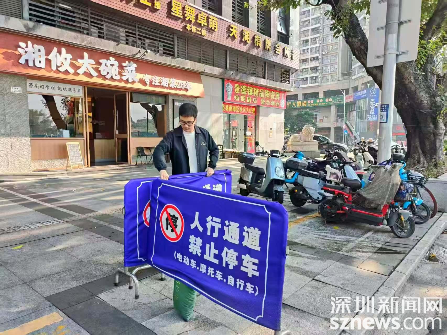 针对非机动车管理这一城市治理痛点,廖志斌和同事们摒弃“一刀切”模式,推动治理从“末端管理”转向“源头疏导”。他们利用早晚高峰,蹲守在地铁口、幼儿园、关口等重点区域,实地观察、记录车辆流动规律,精准梳理停车需求。在此基础上,联动交警、社区科学规划,新增及优化非机动车停放点。同时,在关键路段加装物理隔离护栏,既守护了盲道与消防通道的畅通,也引导形成了有序停放的自觉。