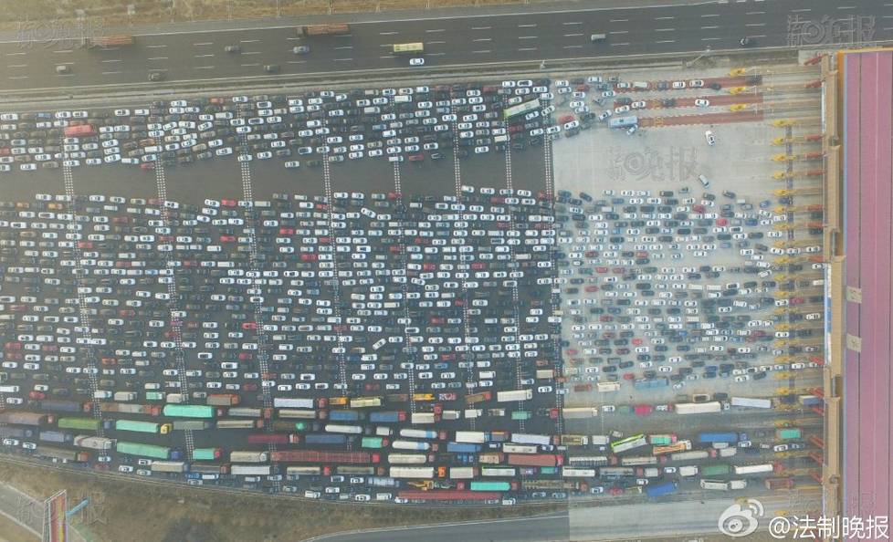 3点开始,京港澳高速在出现拥堵情况。有记者通过现场航拍看到,大批车辆聚集在北京市界收费处等待停车发卡收费。