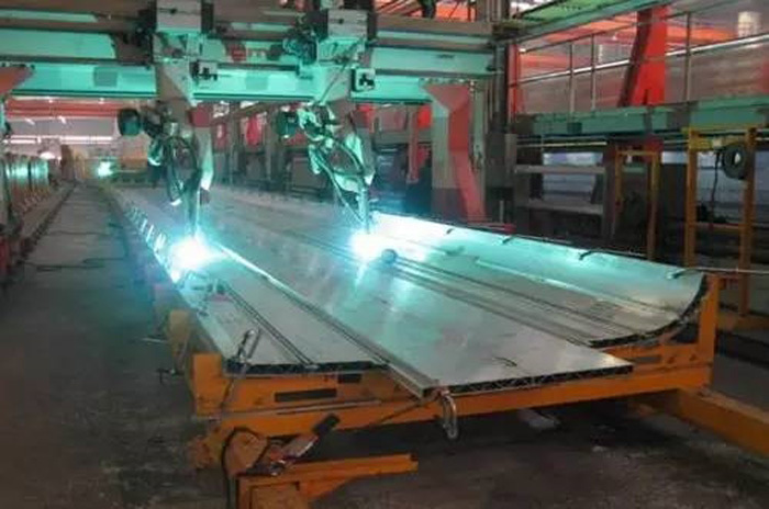 车体加工的长焊缝全部由机器人完成,小的部位由人手工焊接。图为机器人焊接过程。