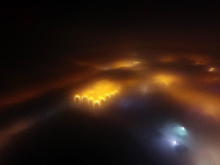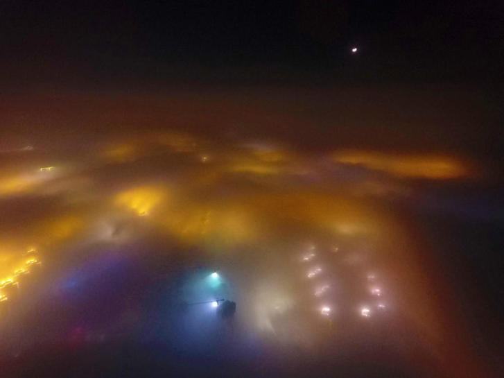 2017年01月03日,天津,夜晚高空月色依旧明亮,航拍雾霾笼罩津城。视觉中国