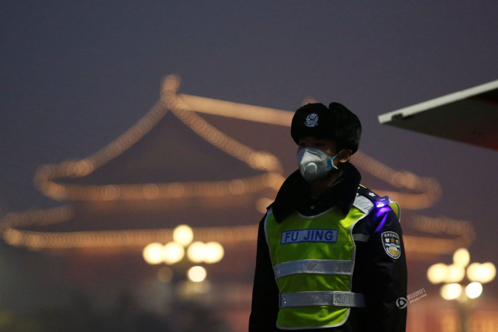 2017年1月3日,北京,一名戴着口罩的辅警在天安门广场上执勤。摄影:Thomas Peter