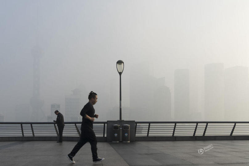2017年1月3日,上海,受大雾天气影响,陆家嘴地标建筑仅剩轮廓,上海中心大厦几乎消失在大雾及灰霾中。王冈/视觉中国
