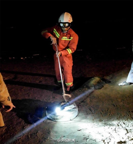 祈福者把蟒蛇放生沙滩 消防员半夜抓蛇
