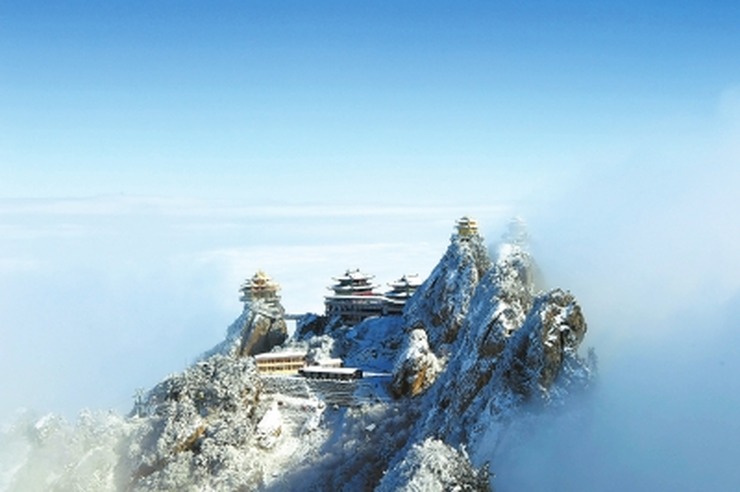 1月8日,栾川县老君山雪后初晴,在海拔2000米的伏牛山主峰上,白雪皑皑、银装素裹,云海浮现与蓝天白云交相辉映,绝壁道观似琼楼玉宇幻如仙境。河南日报记者王铮摄