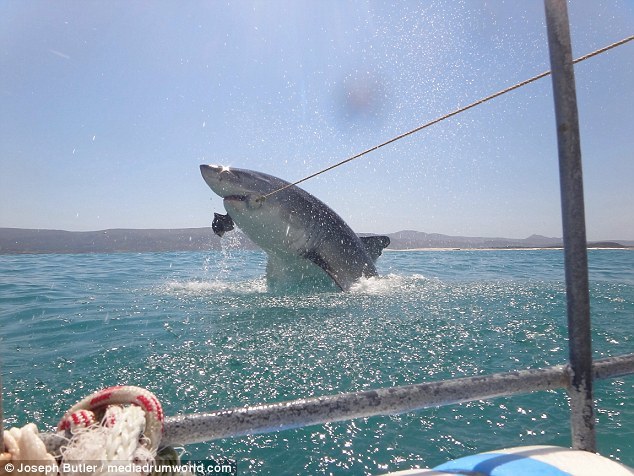 惊悚时刻:4米长大白鲨距离游船咫尺之遥