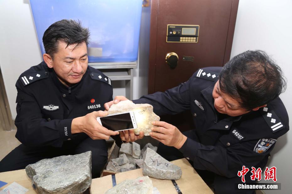 1月12日上午,海口海关召开新闻发布会,通报近日捣毁的4团伙走私近20亿元人民币宝石大案。据悉,该案20名主要目标嫌疑人全部到案,现场查扣琥珀、查罗石、玉石等各类原石及成品近60吨。海口海关相关负责人表示,上述案件是近年以来中国海关缉私部门查获的案值最大宗走私进口宝石案。图为海关缉私警察查验走私宝石原料现场。中新社发海口海关供图