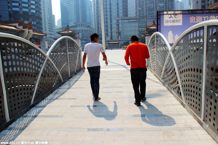 重庆渝中区临江门附近一家新建楼盘上,悬空架起了两座悬空天桥,天桥离地68.5米,22层楼高,让过往市民心惊肉跳,被称为“最牛悬空天桥”。何渝/东方IC