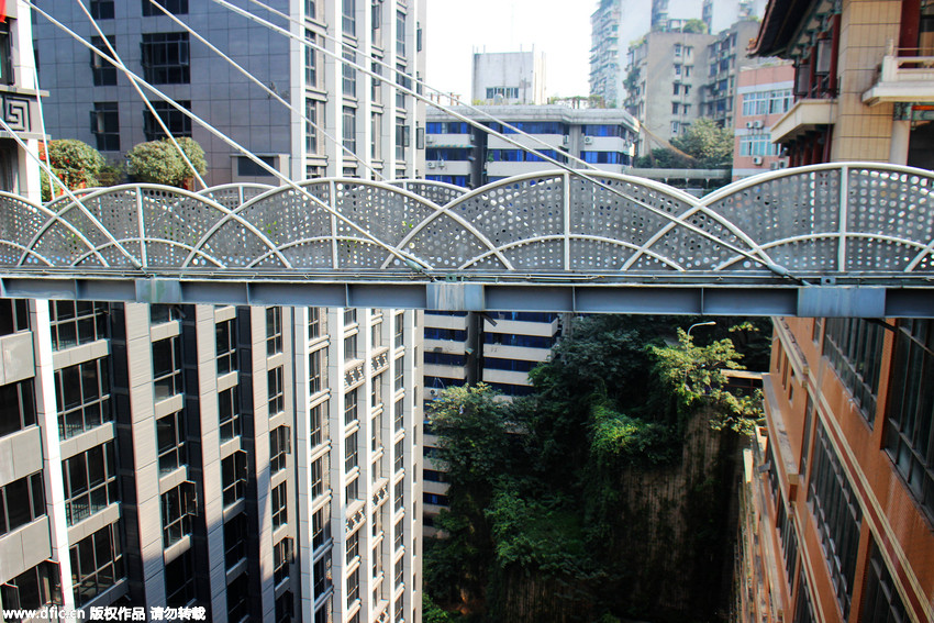 重庆渝中区临江门附近一家新建楼盘上,悬空架起了两座悬空天桥,天桥离地68.5米,22层楼高,让过往市民心惊肉跳,被称为“最牛悬空天桥”。何渝/东方IC