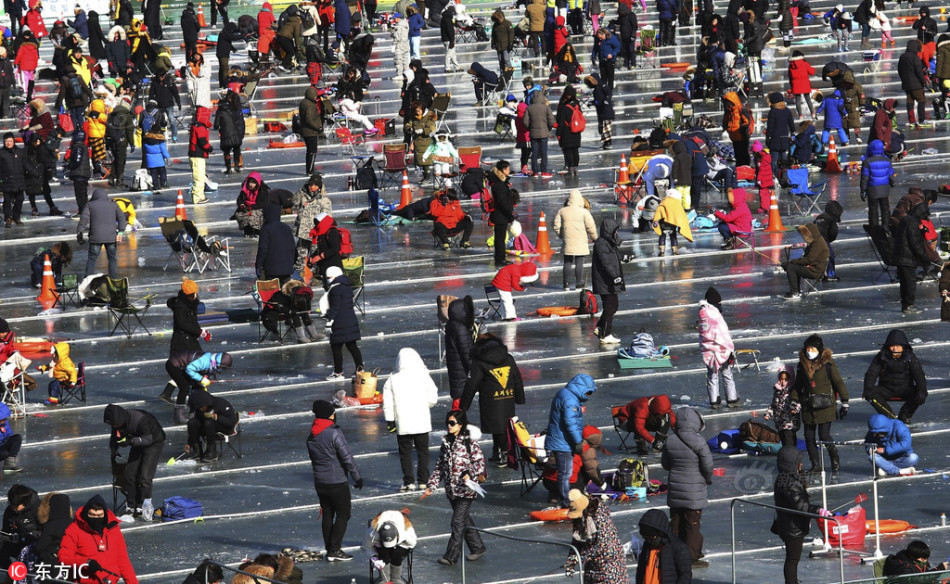 当地时间2017年1月14日,韩国华川,华川山鳟鱼庆典开幕,活动会持续3周。华川山鳟鱼庆典从2003年开始举行,自2006年起每年有超过100万人参加。图为民众参加钓鳟鱼大赛。若垂钓成绩不佳,还可以尝试徒手抓鱼。图片来源:东方IC