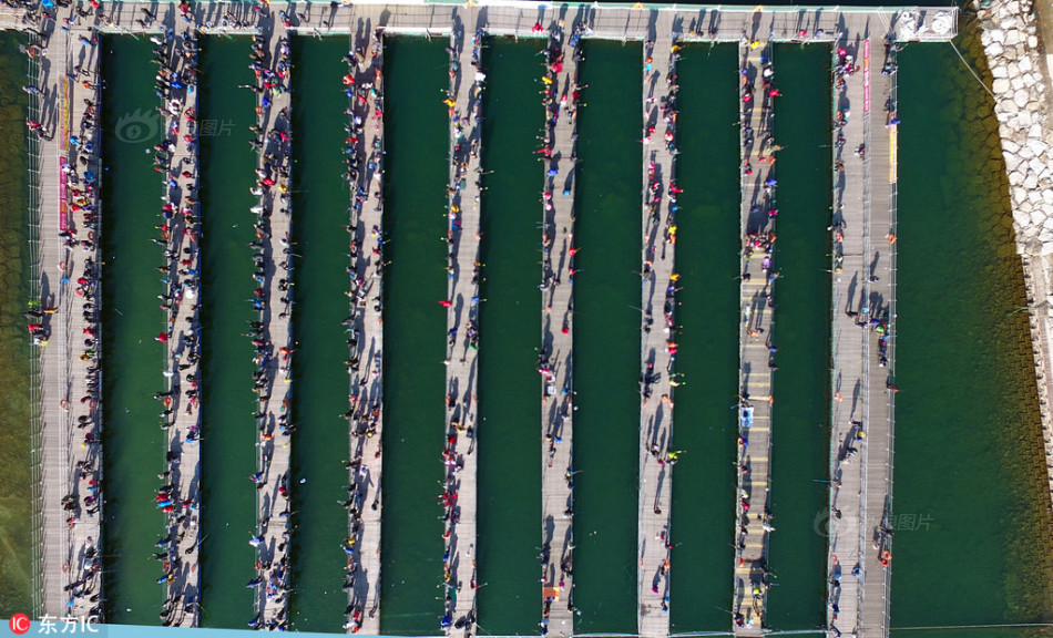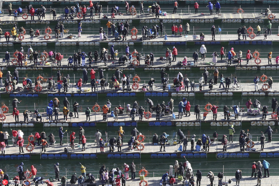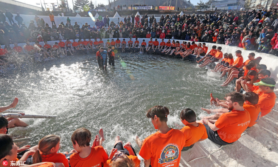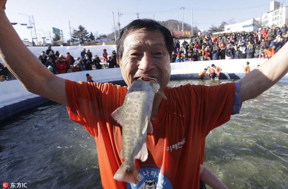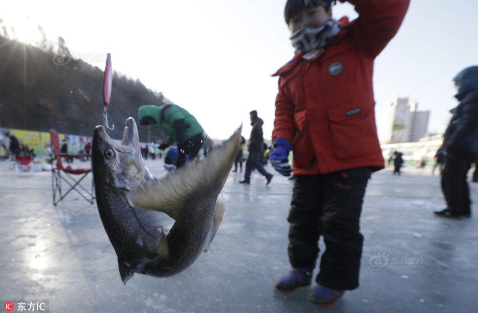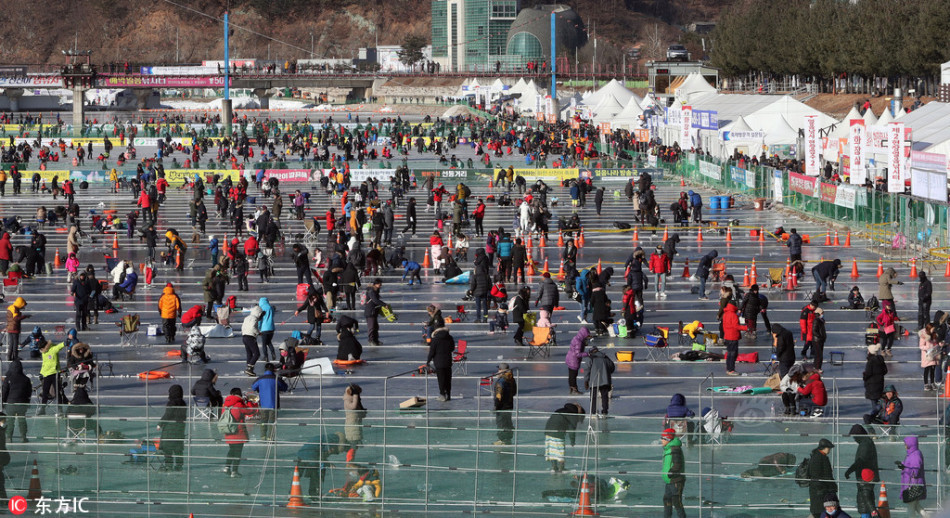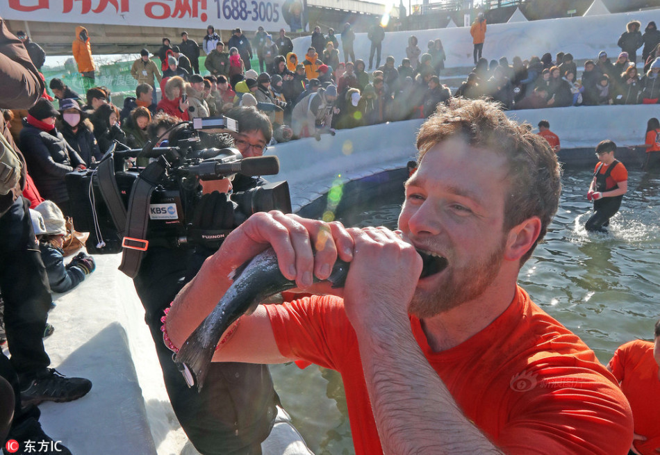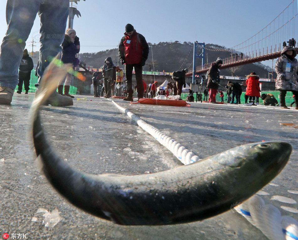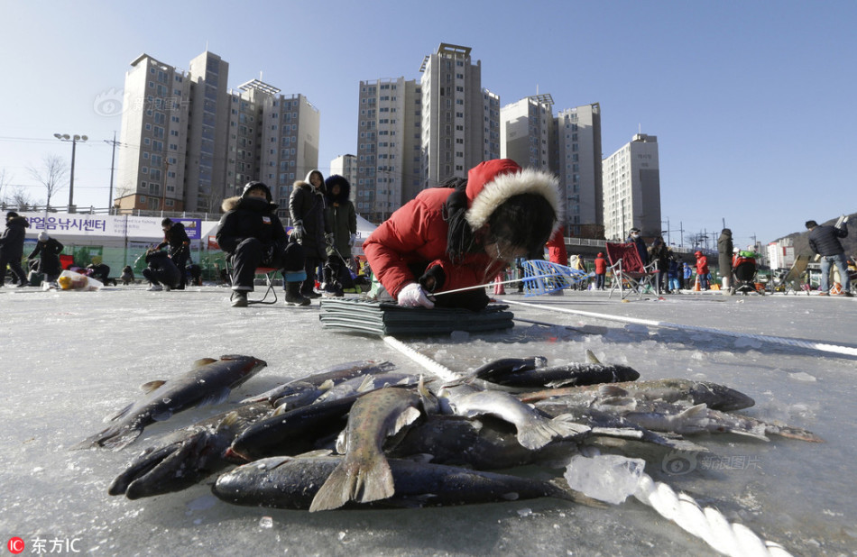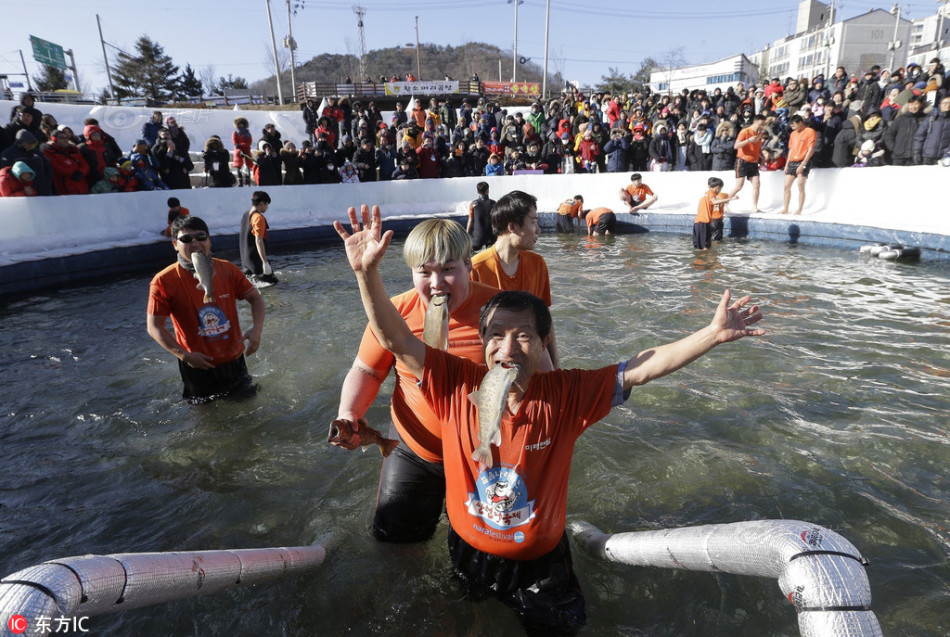 当地时间2017年1月14日,韩国华川,华川山鳟鱼庆典开幕,活动会持续3周。华川山鳟鱼庆典从2003年开始举行,自2006年起每年有超过100万人参加。图为民众参加钓鳟鱼大赛。若垂钓成绩不佳,还可以尝试徒手抓鱼。图片来源:东方IC
