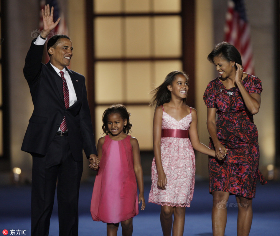 当地时间2008年8月28日,美国丹佛,民主党总统提名人奥巴马携一家人参加民主党全国大会。图/东方IC