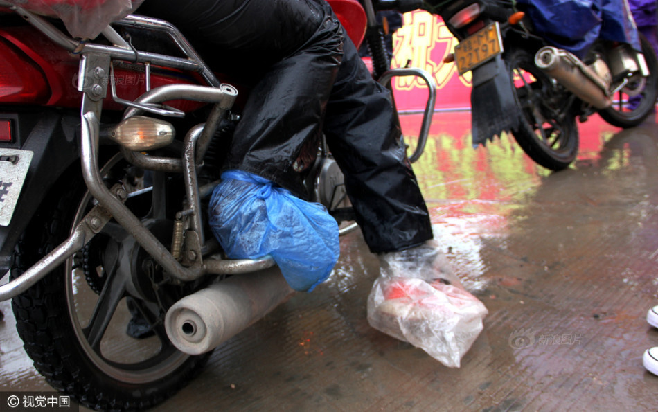 骑手们双脚缠着塑料袋子,防寒防雨。