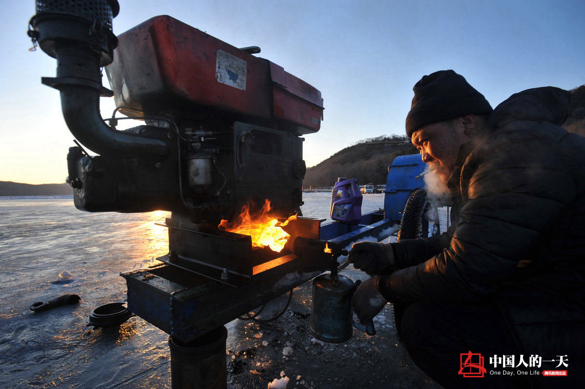 夕阳下,齐国龙点燃了喷枪,烘烤着冰锯的发动机油底盒,将凝固的机油融化。齐国龙一边来回移动着喷枪一边说:“这台机器陪我好几年了,里面的轴瓦和活塞环快到寿命了,这次拆开都换新的。”