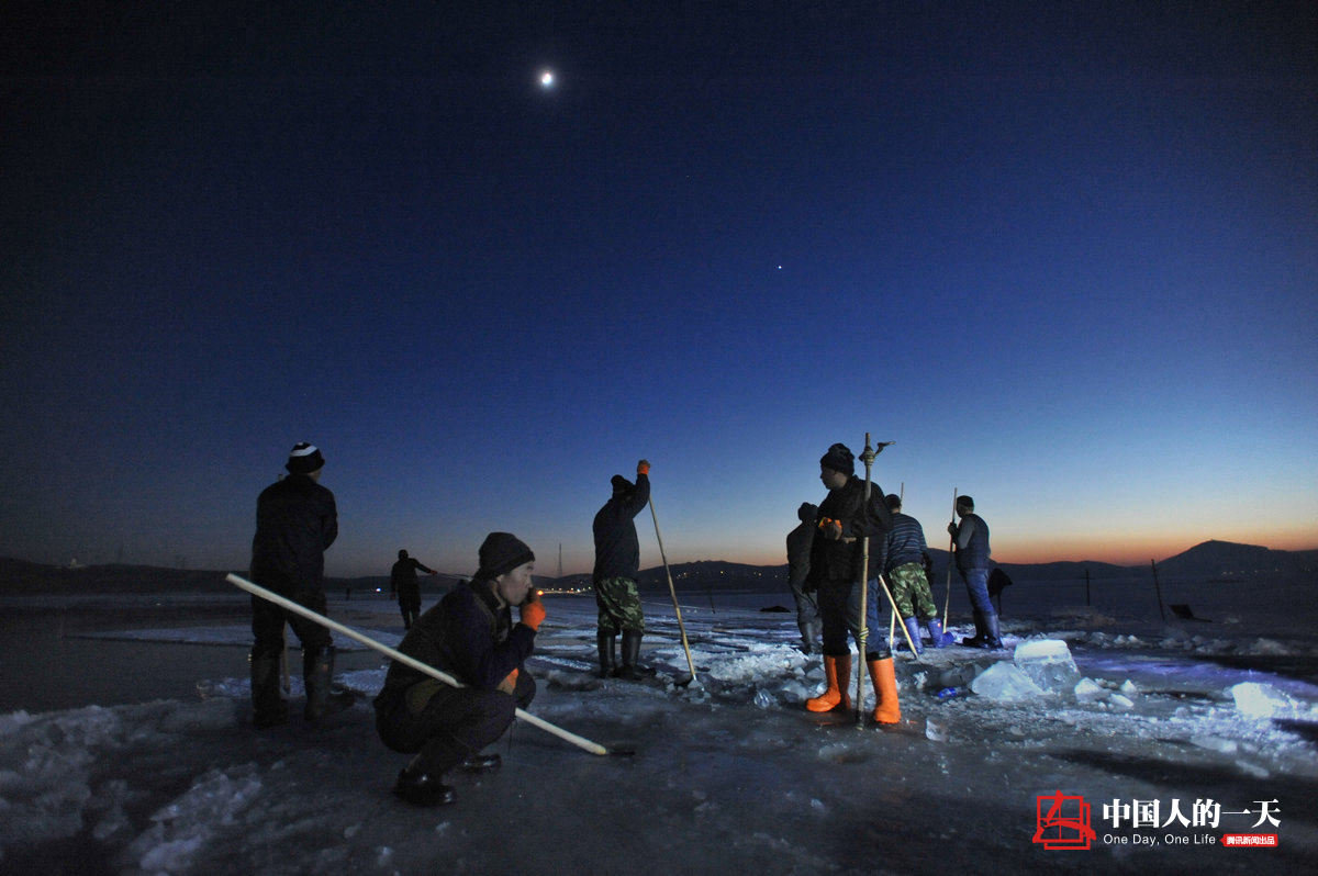 暮色中,采冰人在工作间歇点燃香烟驱赶倦意。