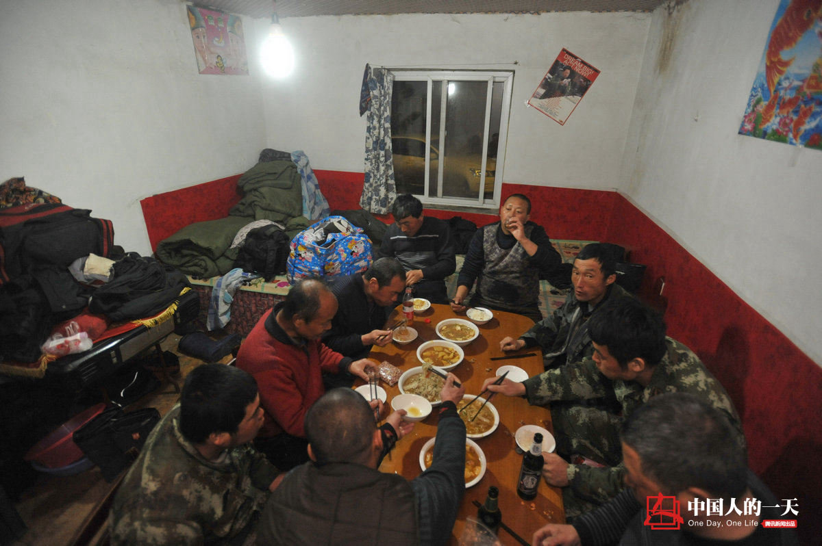 工友们聚在一起吃晚饭,齐国龙喝起了啤酒,他说“这样可以解解乏”。