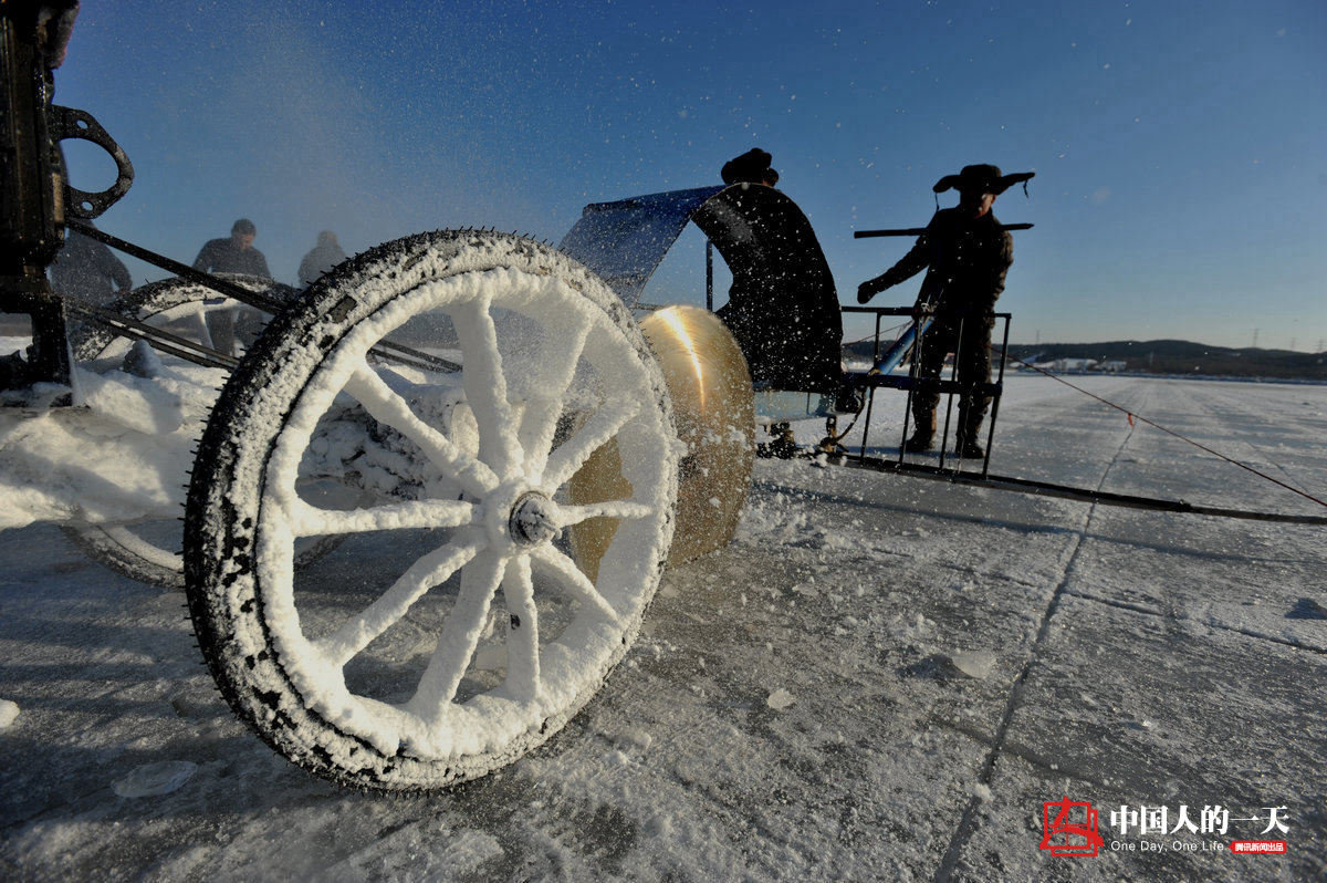 采冰人多来自被称为“采冰之乡”的哈尔滨市松北区万宝镇,他们是种地的农民,冬闲时专职采冰。万宝镇有的一个村里就能组成好几个三十来人的采冰队。哈尔滨冰雪大世界的冰源就是他们一块块的从松花江里拖拽出来的。