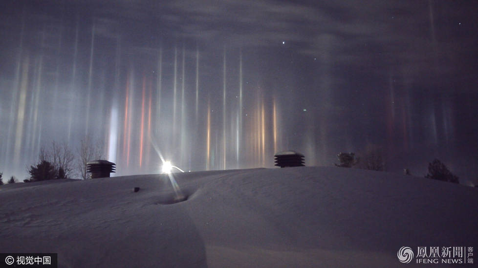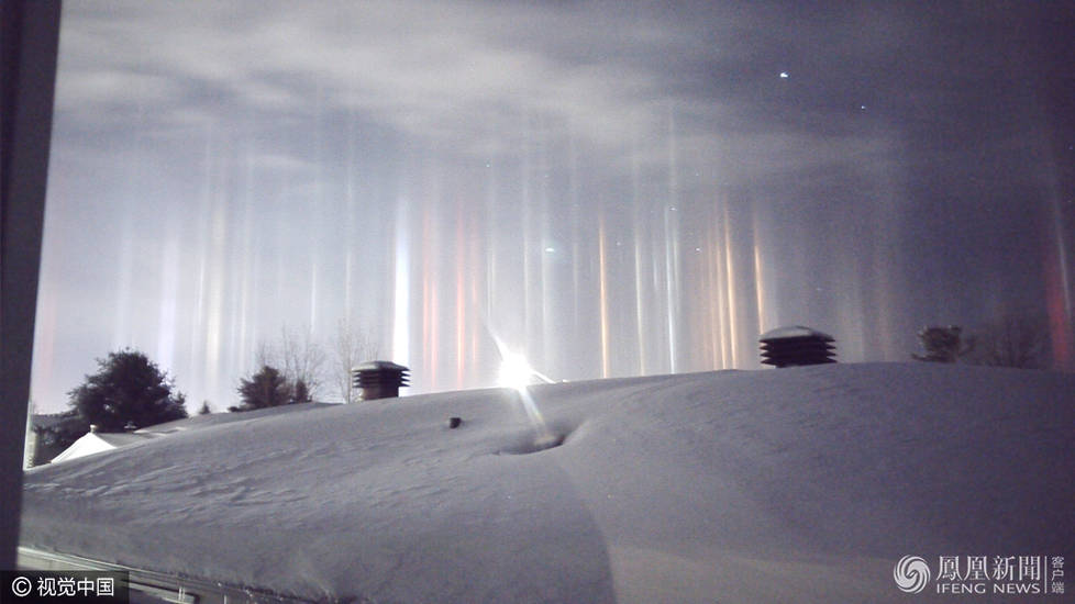 当地时间2017年1月13日,加拿大安大略省,33岁的Timothy Joseph Elzinga半夜起床照看哭闹的两岁儿子时发现并记录下窗外美丽的光柱。