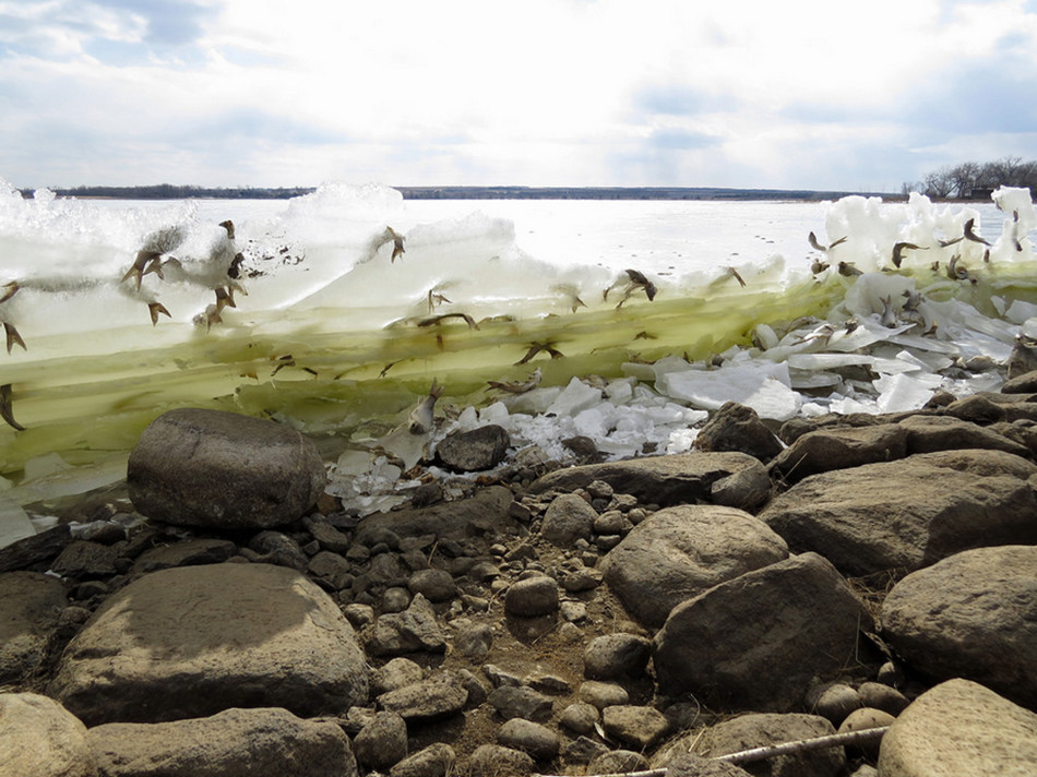大学教授凯丽・普瑞亨在美国南达科他州的一自然公园里拍下了湖鱼被水冻结在空中的奇特景象,仿佛是鱼儿跃出水面在空中时被冰封住的一样。