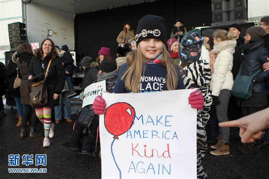 1月21日,在芬兰赫尔辛基,一名示威者手持标语参加集会。特朗普就任美国总统后,为呼应“华盛顿妇女游行”,芬兰首都赫尔辛基21日举行集会,反对性别歧视和种族歧视。据组织者称,当天约有500人参加了示威活动。新华社记者李骥志摄