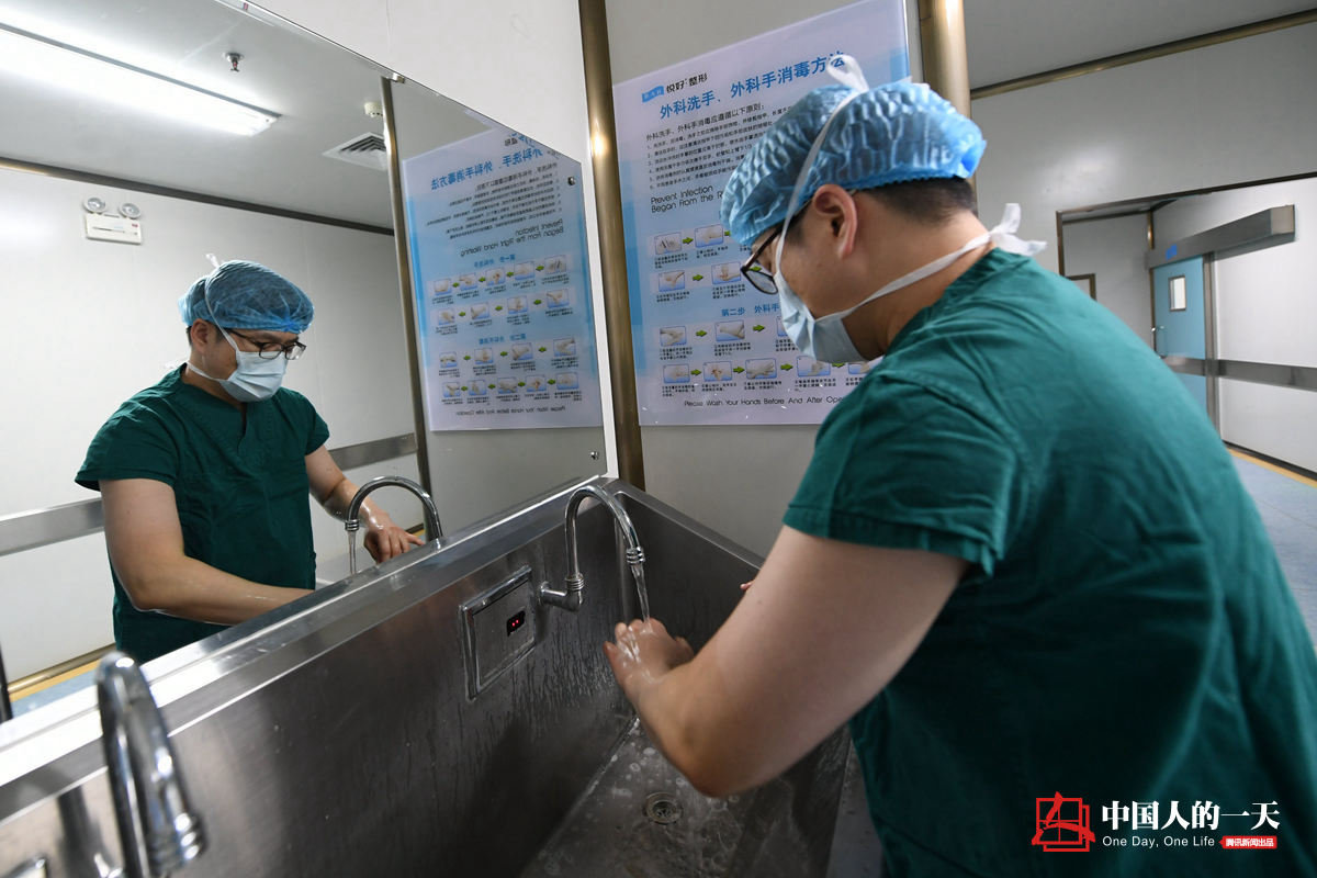 手术前,按照流程,裴柄万一丝不苟,认认真真地将自己的双手进行清洗消毒。