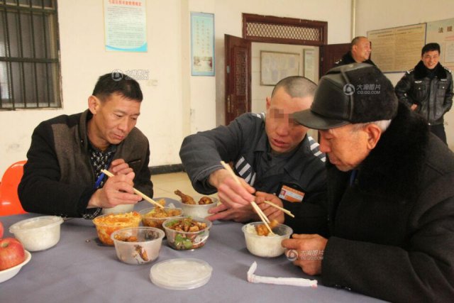 2017 年 1 月 18 日,蒲昌怀来到湖北省沙洋县某监狱探望儿子,见面的两个小时里,父子俩一直紧紧的牵着手,生怕再次分离。蒲昌怀对儿子说:" 爸一直等你回来!" 付杰哭了,流浪 26 年,这一次,他终于找到了家!图为付杰与父亲哥哥团聚后一起吃饭。