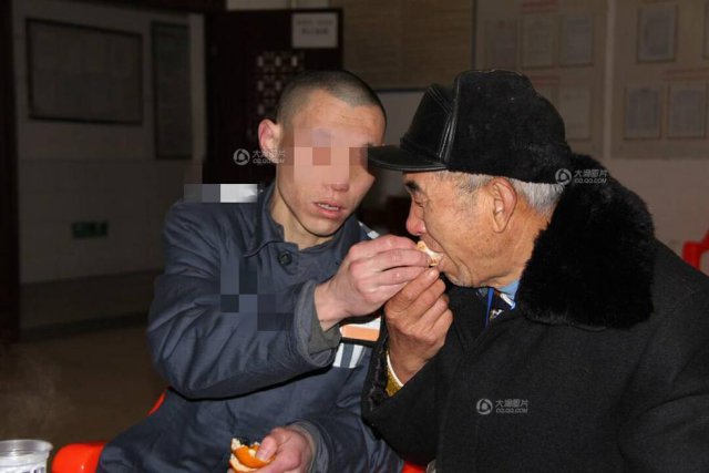 为了完成妻子的遗愿,50 多岁的蒲昌怀只要听到一点有关儿子的消息,他都会去找寻,跑遍云阳、开州、万州三个区县,甚至还前往重庆主城区,但仍没有儿子的任何消息。随着年龄的增长,63 岁的他对儿子的想念愈发强烈,对妻子的愧疚愈发浓烈,时常来到妻子的坟上哭诉跪求妻子原谅。可他那里想到当时的冲动让儿子在外流浪了 26 年,而且还把儿子推向了违法犯罪的道路,导致他锒铛入狱。图为付杰与父亲见面时喂父亲吃橘柑。