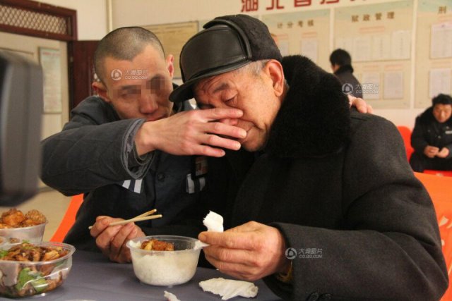 2016 年 8 月 4 日,湖北沙洋监狱的警官 " 桂豪 ",在处理完一名服刑人员认亲后,得知另一名服刑人员付杰也是一名无身份的人员,尽管即将拿到 6 个表扬、1 个记功的行政奖励可以减刑,却因身份问题没能获得法院批准。图为付杰为父亲擦眼泪。