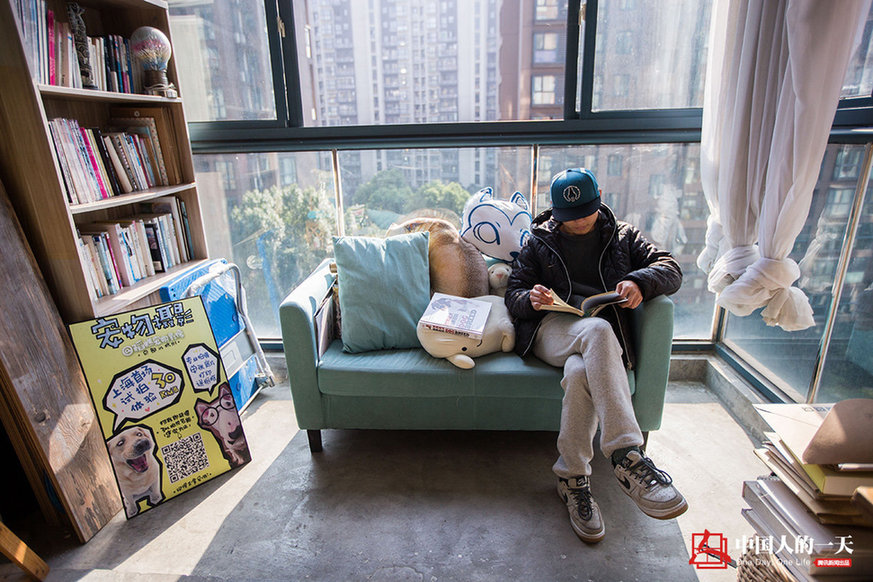 结束拍摄,均木回到工作室里看书。均木专心于学习动物科学专业的知识,因为除了常见的猫狗,他有时需要拍摄蜗牛、蜥蜴、蜘蛛和蛇等宠物。
