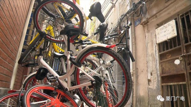 不仅是庄女士家,在这担水巷的另一处,也同样堆放着七八辆共享单车。附近的店家告诉记者,这些车长期堆放在这里,给进出小巷的行人车辆带来了不小的麻烦。执法人员将长时间堆垒在庄女士家门口的共享单车一辆辆地搬运下来,准备将它们暂扣集中送往堆场。