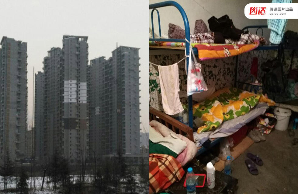我是一名90后农民工,暂住西安。每天,我都会干外墙刮腻子、刷涂料的活儿。看见这栋楼上白、灰、黄三种颜色了吗(左图)?那就是我的成果。未来的3个月,我将和6名工友一起住在这20平方米的出租房内(右图),350元的租金。——来自腾讯网友“小夏”