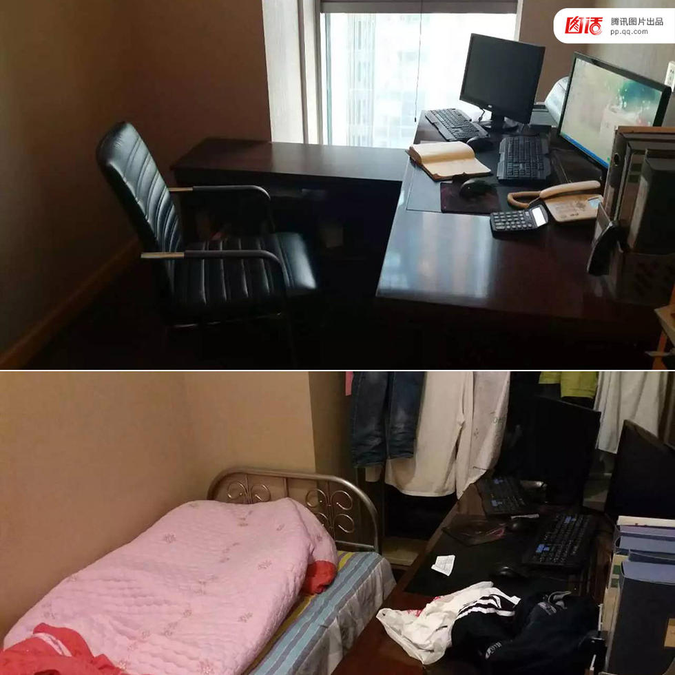 下图是晚上的宿舍;上图是我收拾之后,宿舍变回了公司办公室。为了省钱,我跟老板申请住在公司办公室。这里白天是办公室,晚上就成了我的住所。为了不给同事添麻烦,每天早晨我很早起床,把床铺和行李全都收拾起来,仔细打扫,不留下一根头发。一个人在北京打拼,刨去工作和睡觉,周末我就在附近小广场上卖发光玩具挣钱。到了晚上,我也只能和老婆孩子视频聊天。说实在的,很孤独。家里人只知道我住公司,但我不敢告诉他们是这样的“宿舍”。——来自腾讯网友“袁军”