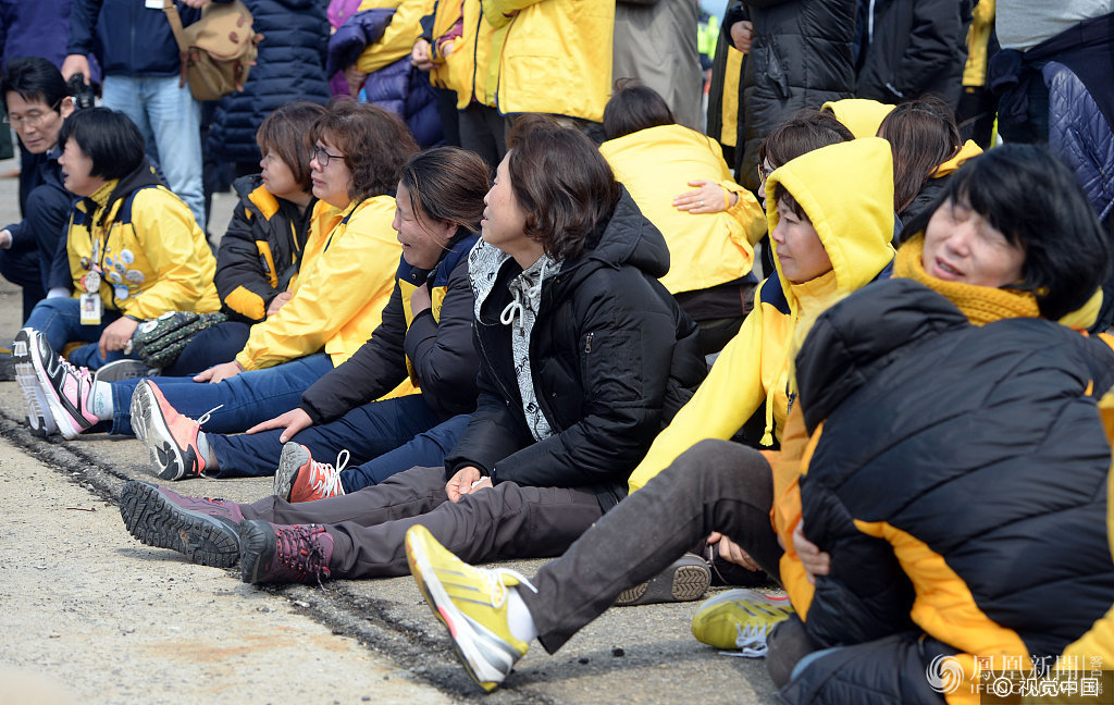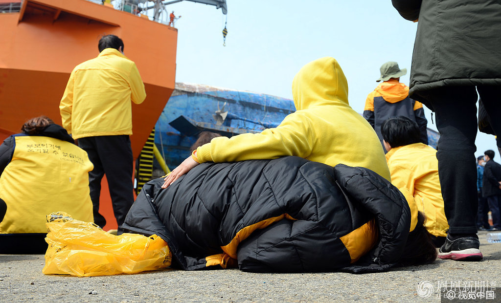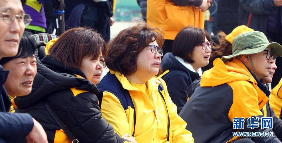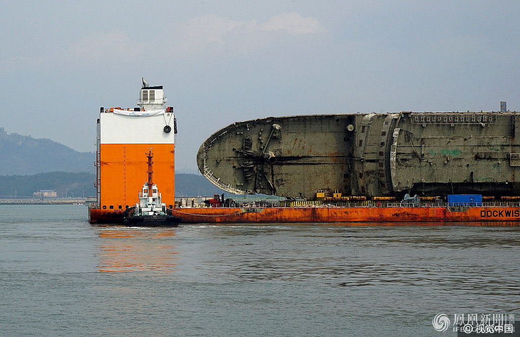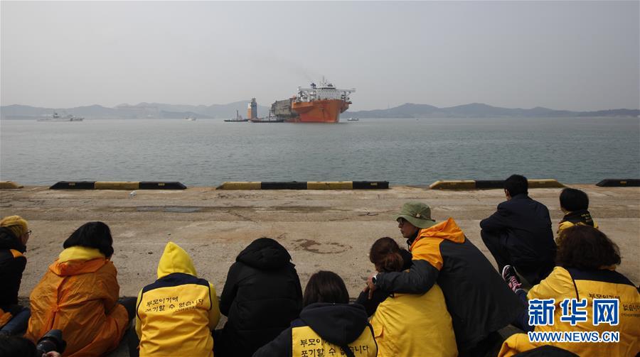 2017年3月31日,在韩国木浦新港,“世越号”沉船即将靠岸。韩国“世越号”沉船3月31日抵达韩国全罗南道木浦新港。2014年4月16日,载有476人的“世越号”客轮在韩国全罗南道珍岛郡屏风岛以北海域意外进水并沉没,船上仅172人获救,295人遇难。迄今仍有9人下落不明。
