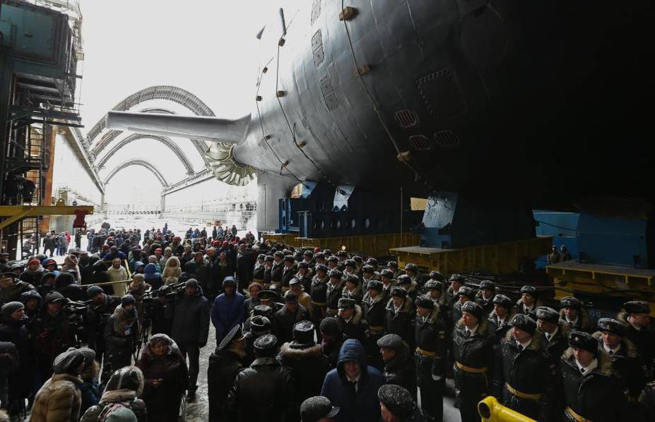 随着金属轮滚动,喀山号慢慢倒出船厂,在海军士兵和工人的欢呼声中,军官按传统拿着一瓶香槟砸向船体。