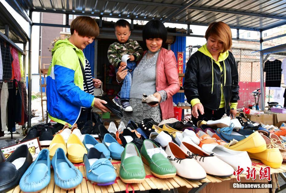 4月5日,河北安新县一集市上,几位民众正在选购鞋。 中新社记者 翟羽佳 摄