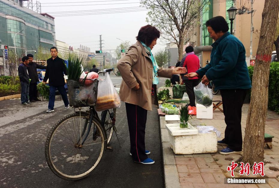 4月5日,河北容城,民众正在购买路边小摊贩出售的韭菜。 中新社记者 翟羽佳 摄