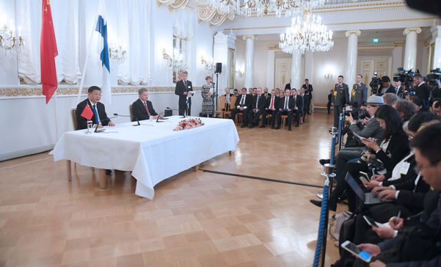 4月5日,国家主席习近平在赫尔辛基同芬兰总统尼尼斯托举行会谈。这是会谈后,两国元首共同会见记者。(新华社记者张铎摄)