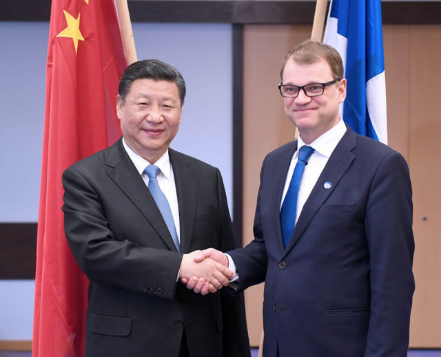 4月5日,国家主席习近平在赫尔辛基会见芬兰总理西比莱。(新华社记者张铎摄)
