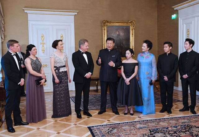 4月5日,国家主席习近平在赫尔辛基同芬兰总统尼尼斯托举行会谈。会谈前,习近平出席尼尼斯托在总统府庭院举行的隆重欢迎仪式。这是习近平和夫人彭丽媛同尼尼斯托和夫人豪吉欧在欢迎仪式上。(新华社记者兰红光摄)