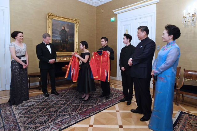 当地时间4月5日晚,国家主席习近平和芬兰总统尼尼斯托在赫尔辛基共同会见刚刚参加完2017年世界花样滑冰锦标赛的中芬两国冰雪运动员代表。习近平夫人彭丽媛和尼尼斯托夫人豪吉欧参加会见。这是芬兰运动员向习近平和夫人彭丽媛赠送运动衣。(新华社记者饶爱民摄)