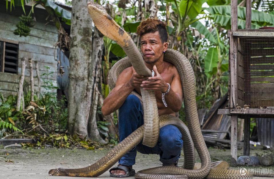 4月1日,印度尼西亚廖内省,一名叫Ice Habibi的男子玩眼镜王蛇。这两条约三至四米长的眼镜王蛇在骚扰附近居民并咬死其中一人后,被Ice Habibi徒手抓获,现由他驯养成宠物。