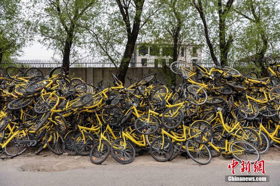 4月7日,北京朝阳区一ofo共享单车维修点“车满为患”,长约上百米的道路一旁堆满了数千辆等待维修的故障共享单车,有些地方的车堆超过2米高。中新社记者 崔楠 摄
